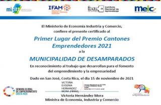 El Ministerio de Economía, Industria y Comercio reconoce el 1° lugar a la Municipalidad de Desamparados, por obtener el Premio Cantones Emprendedores 2021 debido a las labores ejecutadas en emprend